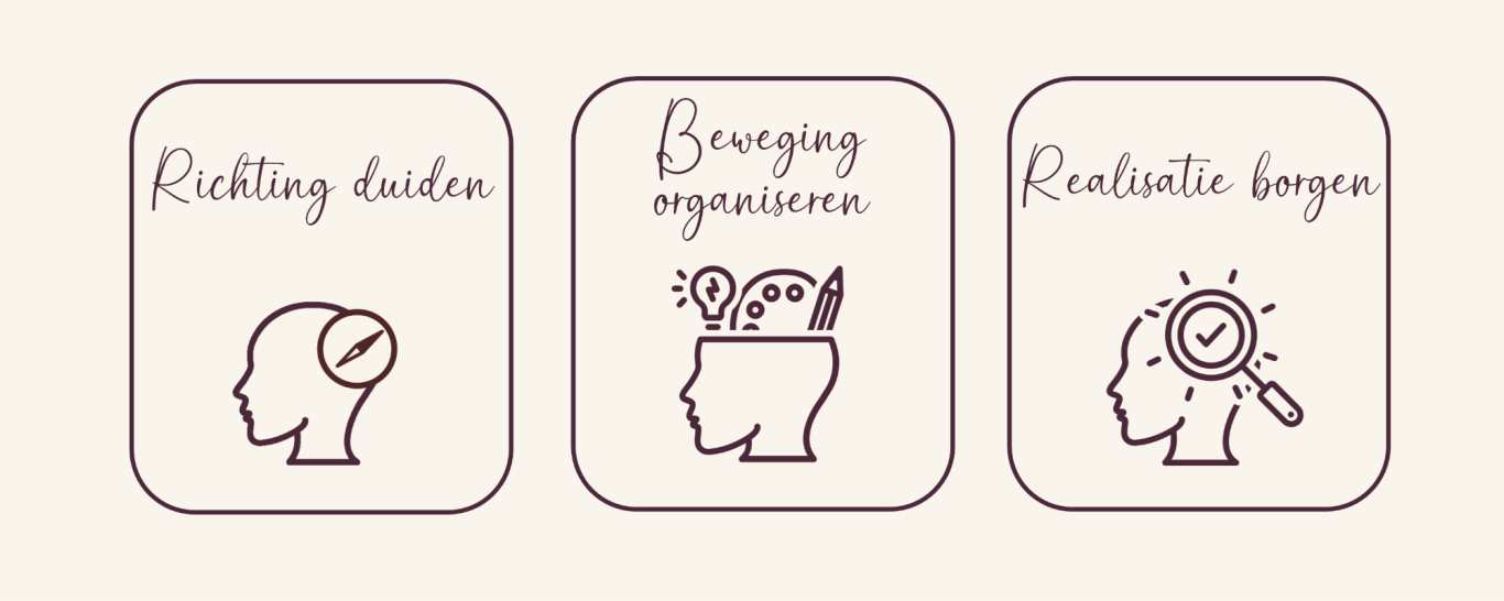 • Beweging organiseren: Structuur, gedrag en besluitvorming sluiten logisch op elkaar aan.